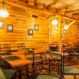 Интерьер кафе «Местечко» напоминает уютный домик в горах, оформленный в альпийском стиле. Ничего лишнего, только натуральное светлое дерево, характерный декор, теплые оттенки и камин для создания домашней атмосферы.